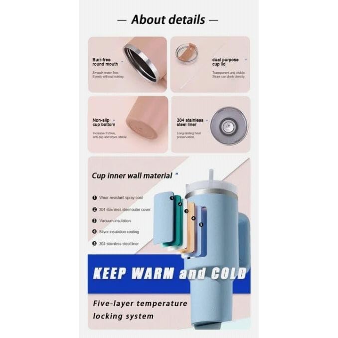 - معزولة بتفريغ الهواء: تحافظ تقنية العزل بتفريغ الهواء على مشروباتك ساخنة أو باردة لفترة طويلة، كما أن الهيكل المزدوج الجدار من الفولاذ المقاوم للصدأ يجعل الكوب متينًا ومقاومًا للصدأ.