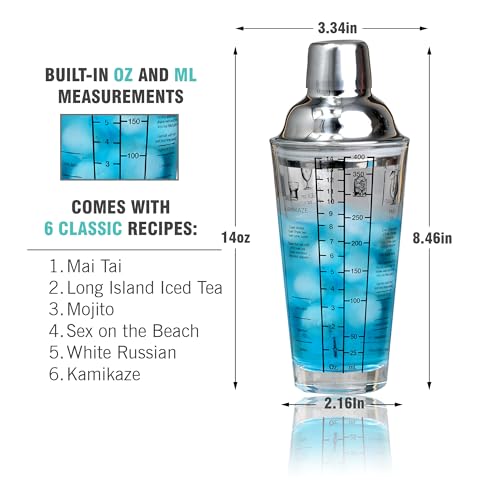 EVERYDAY COCKTAIL - EVERYDAY COCKTAIL ® | Professional Glass Cocktail Shaker 14 oz | Martini Shaker | Shaker with Recipes on Side | Clear Bar Shaker with Measurements | Built in Strainer with Seal | Margarita Shakers