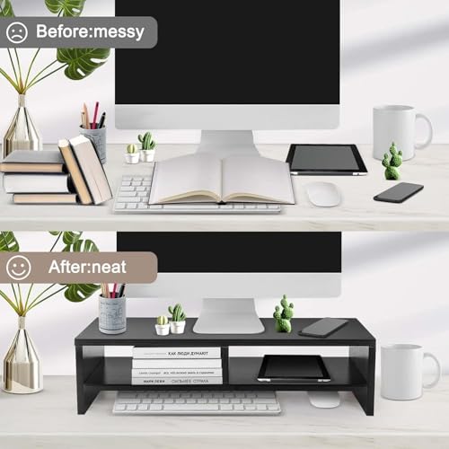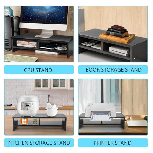 - ✅MULTIPURPOSE USE: This monitor stand is designed with a two-tier storage facility that offers ample space for organizing multiple essentials such as mouse, keyboard, laptop, and other daily necessities.
