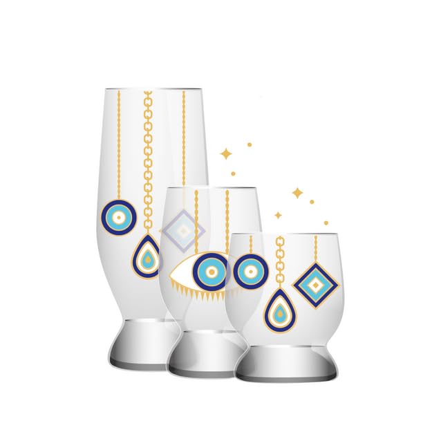 Generic - Evil Eye Themed Drinking Glasses Set, White with Gold and Blue Design, Silver Base, 18 Pieces