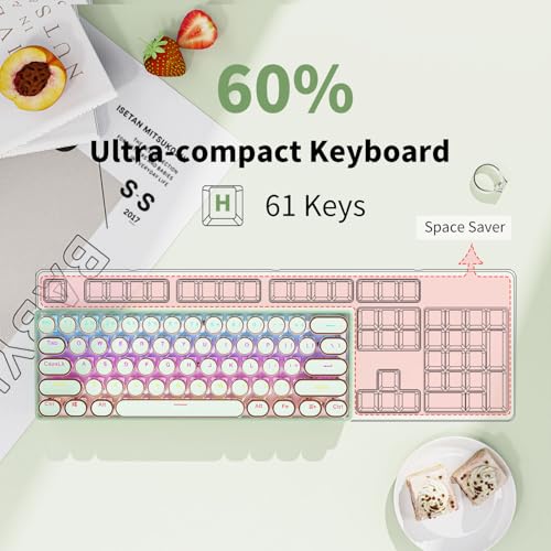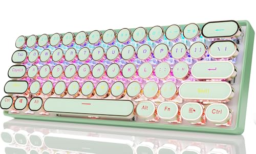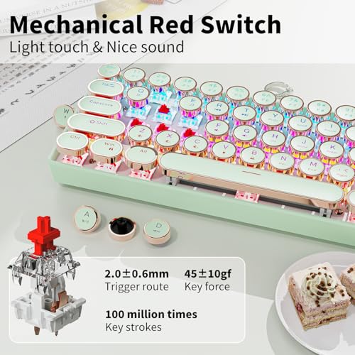 - Retro Typewriter Style Round Keycaps: G61 wireless typewriter keyboard uses double-shot injection retro punk round keycap with clear backlight, extremely durable and characters do not fade. Stepped floating keycaps that fit your fingertips perfectly, precise position. Ergonomic foot support makes typing less tiring and more comfortable. Highly-durable mechanical red switch responds faster. The sound is smaller and quieter. Suitable for: office/game/dormitory/cafe/travel.