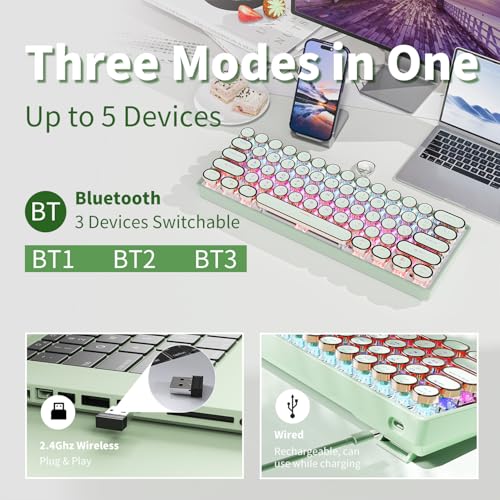 - Three Mode Connect: G61 retro typewriter keyboard wireless provides three connection modes, Bluetooth 5.0, 2.4Ghz wireless mode, USB C wired mode. Supports connecting 5 devices at the same time. Press FN & Z/X/C/B/V key combination to switch BT1/BT2/BT3/2.4G/wired. You can switch between tablet, laptop and phone any time. Meet you any needs of work, games, study.