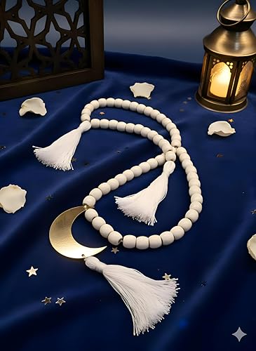 Generic - سبحة ديكور استثنائية من خرز خشبي طبيعي بحجم كبير مكونة من 50 خرزة، شرابات مكرمية ناعمة مع دلاية هلال خشبية ذهبية بتصميم فريد