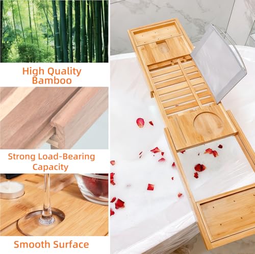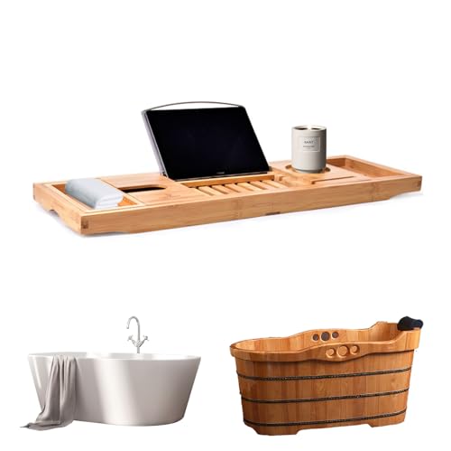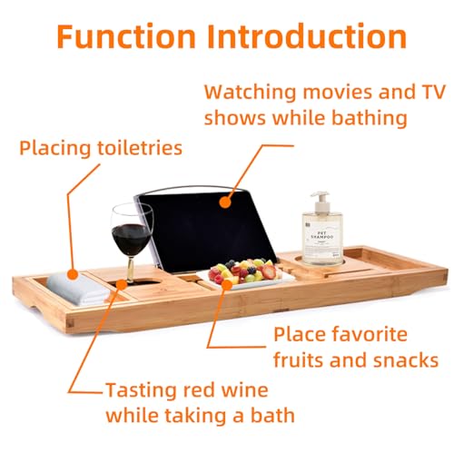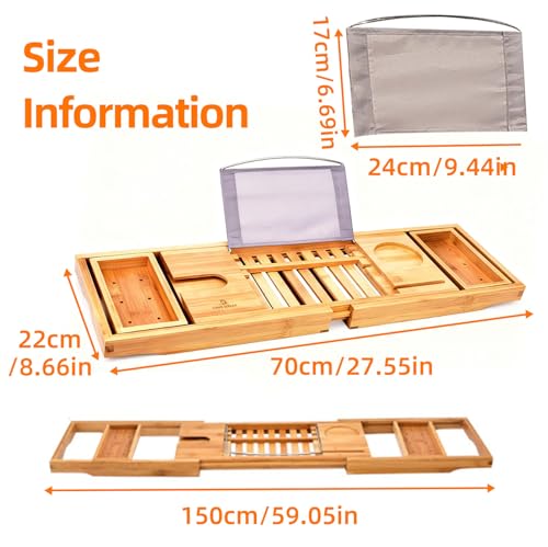 - 【Adjustable Bath Tray】: This bamboo bath tray extends from 70cm to 150cm, allowing manual length adjustment without tools. Secure and non-slip, it fits virtually all bath sizes. Effectively prevents tray slippage or scratches to bath surfaces, safeguarding your belongings.