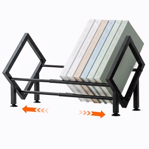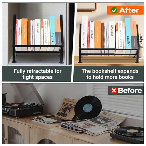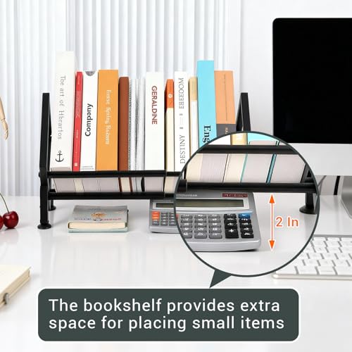 BESHIGH - Expandable Desktop Bookshelf Organizer, Metal Office Tabletop Book Storage Rack, Large Tilting Bookcase for Books/CDs/Magazine Display, Desk Shelf for Top of Desk in Living Room, Home, Office (Black)