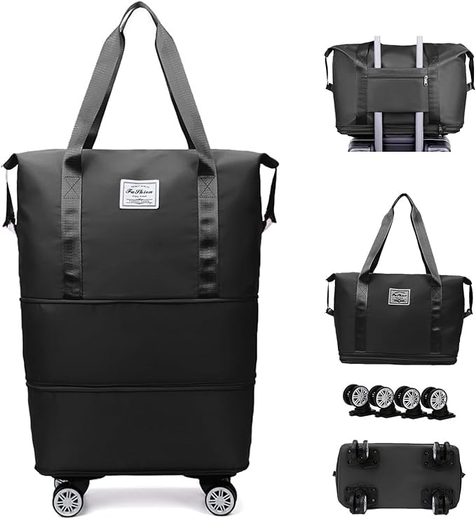 Generic - Expandable Foldable Rolling Duffle Bag with Wheels – 3-in-1 Travel Tote, Weekender Suitcase for Men & Women, Waterproof Oxford Carry-On Luggage – Black, 28L to 58L