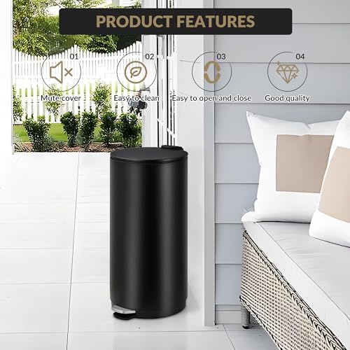 ExploreHorizon - سلة مهملات دائرية للحمام من اكسبلورهورايزون بسعة 8 جالون/30 لتر، سلة مهملات من الستانلس ستيل مع غطاء اغلاق ناعم ودلو داخلي قابل للازالة، سلة اعادة تدوير ضيقة للمطبخ والمكتب (اسود)