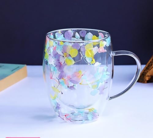 Generic - مج شرب قهوة زجاجي بنقشة زهور جميلة، مج معزول بطبقتين ومقاوم للحرارة ومانع لتكثف بخار الماء ومصمم بمقبض مانع للانزلاق، أدوات شرب للصيف والشتاء، قطعة واحدة، سعة المج 348 مل