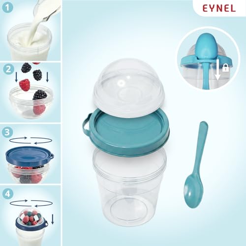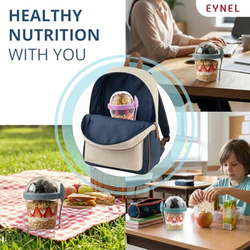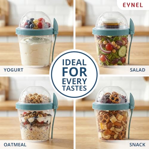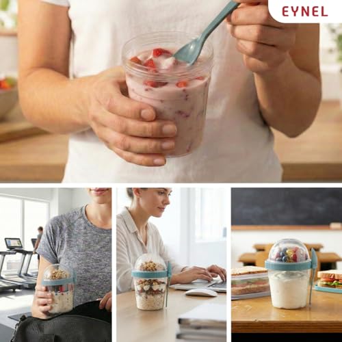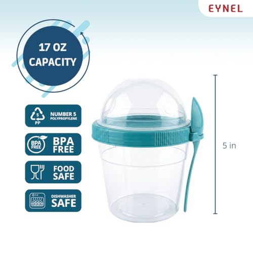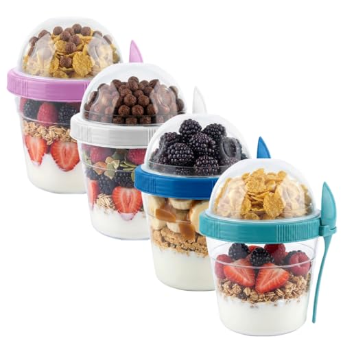 EYNEL - 4 Pack 17 oz Small Breakfast On The Go Yogurt Parfait Cups, Reusable Plastic Containers with Lids and Spoons, Perfect Jars for Overnight Oats Cereal Granola Oatmeal and Snack Prep (4 Colors Set)