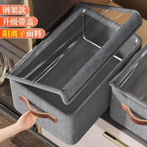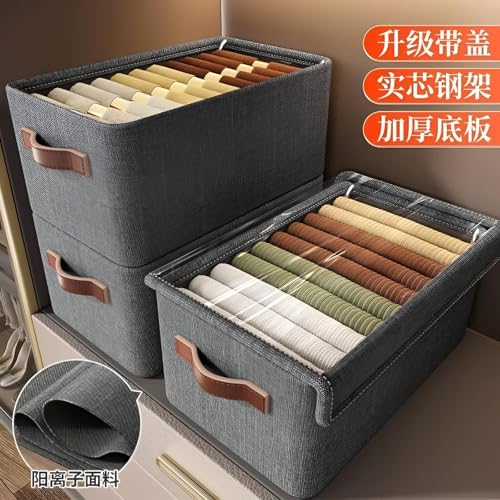 Generic - Fabric Storage Organiser - Grey metal frame with wooden base, leather handles, stackable drawer box for clothes, ideal for bedroom or closet organization
