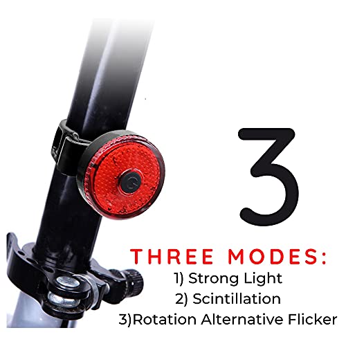 - -MULTIPLE LIGHT MODES: The bike light has 3 light modes: high brightness, med brightness, and flash/strobe. Press the ON/OFF button once to switch through the light mode and press it again for changing the mode. Bike rear light comes with 3 modes: Hight, Flash and Strobe mode. You can switch the light mode freely, which is very convenient.