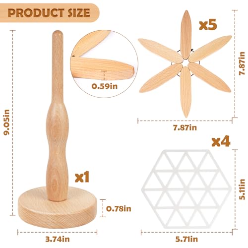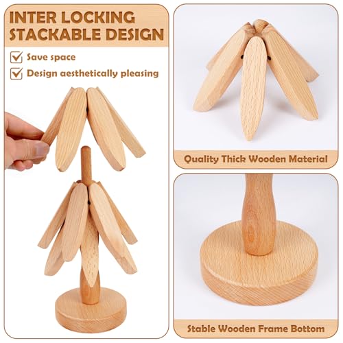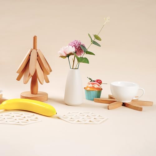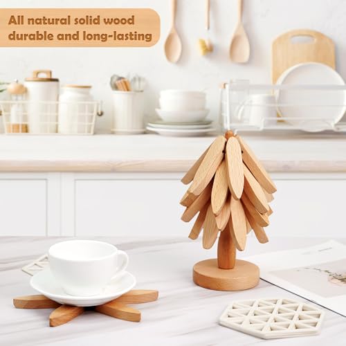 FACULX - حامل أواني خشبية للأطباق الساخنة، قاعدة أكواب خشبية من الفلين للحلل الساخنة والطاسات، مجموعة حوامل شكل شجرة من خشب الزان - 5 حوامل خشبية + 1 حامل + 4 قواعد أكواب سيليكون للتعليق مثل شجرة الكريسماس