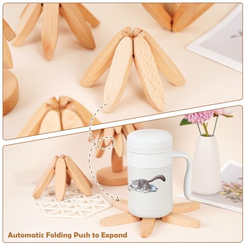 - 【تصميم مبتكر】تحتوي كل دعامة خشبية للأطباق الساخنة على ست قطع خشبية صغيرة، خذ واحدة من الدعامة وضعها مباشرة على سطح المكتب، لا حاجة إلى تسويتها مسبقًا، مباشرة لحمل الجهاز من الأعلى ووضعه ببطء، بسبب الجاذبية، سوف تتفتح تلقائيًا وتلعب دورها الواجب، في كل مرة تستخدمها، إنها تجربة مثيرة للاهتمام! يمكن طيها وتخزينها لتوفير المساحة