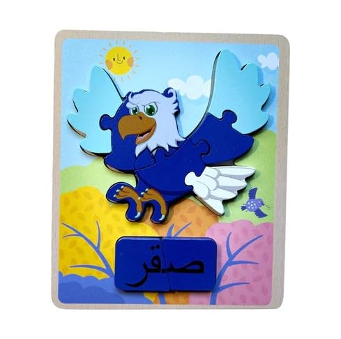 - This high quality wooden card features simple and easy to install, as well as a puzzle that includes Arabic letters and the name of the puzzle form. This card helps children learn the shapes and names of animals, expand their Arabic vocabularies, and learn different colors. It also improves concentration and attention, and develops eye-hand coordination. Ages 2 and up