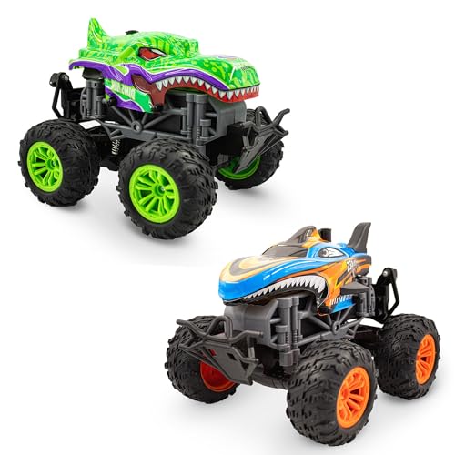 Family Smiles - Kids RC Green Dinosaur Orange Shark Monster Truck 2 Pack Toy Water Spray Haze Lights Sound Effects Remote Control Vehicle 1:16 Scale Gift Toys for Boys