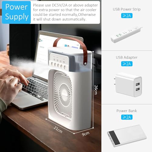 - Leather handle design: makes the evaporative air cooler easy to move between rooms. Adjustable up and down: manually adjust the blowing direction up and down to 60 degrees to create your own personal cooling zone. Removable water tank design: can help you better clean the water tank, and can add ice cubes. Power Supply Methods & Energy Saving Simply connect the USB cable to the devices that support usb port.