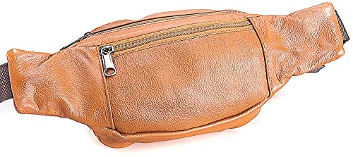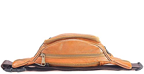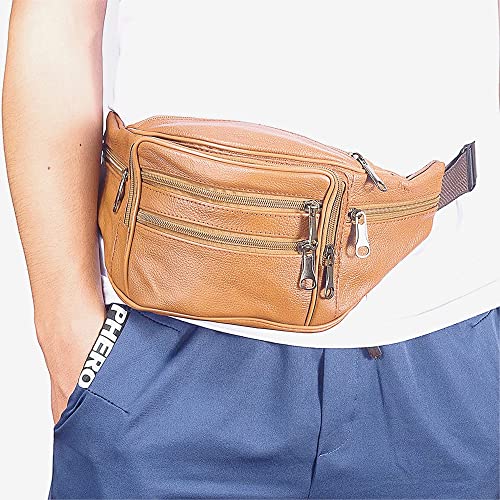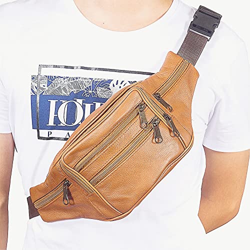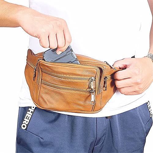 FANNING511 - Fanny Pack Outdoor travel leather Fanny pack,Cowhide Leather Large Size 7 Pockets waist bag.Suitable for outdoor mountaineering, travel, camping, cycling, running, etc.(Light brown)