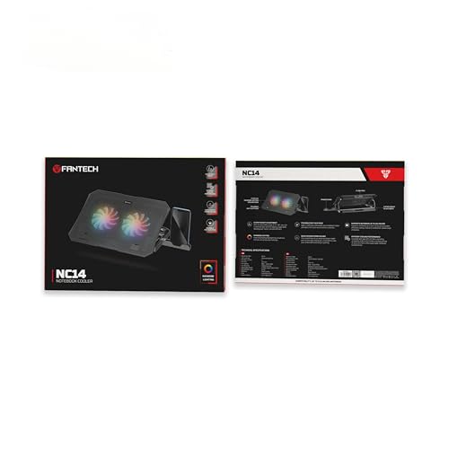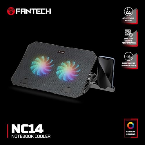 Generic - قاعدة تبريد لابتوب مع مروحتين 125 ملم من فانتك NC14 ، إضاءة RGB قوس قزح، ارتفاع قابل للتعديل، حامل موبايل، منفذي USB، أسود