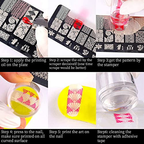 - ❤How to use: Apply some polishing agent to the nail and the desired plate pattern, use the sc to scrape the needless polishing agent on the plate pattern quickly, then press the stamper gently, print the pattern, stamp the stamper scroll to your nails lightly and the pattern will be applied to your nails.