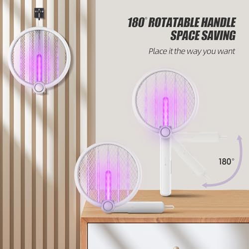 - 【تصميم قابل للطي ومحمول، موفر للمساحة】: مضرب صاعق البعوض هذا مريح حيث يمكن طيه للتخزين والحمل. يدور الرأس إلى 180 درجة لتوفير المساحة عند عدم الاستخدام. بالإضافة إلى ذلك، يمكنك وضعه في شنطتك في أي وقت واستخدامه عند التخييم أو المشي لمسافات طويلة.