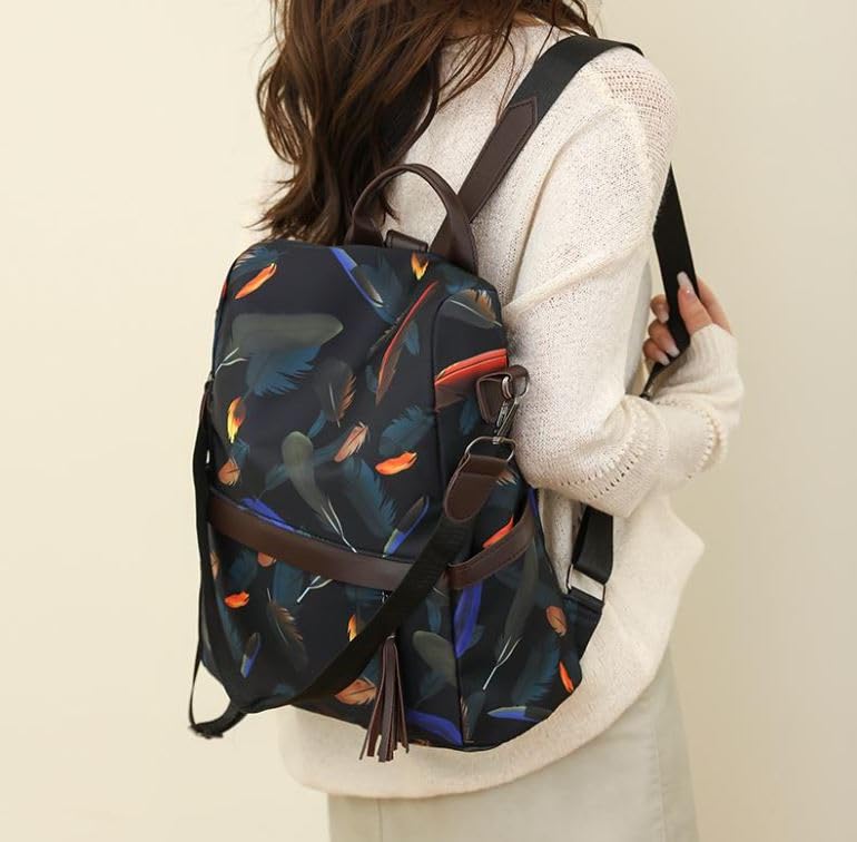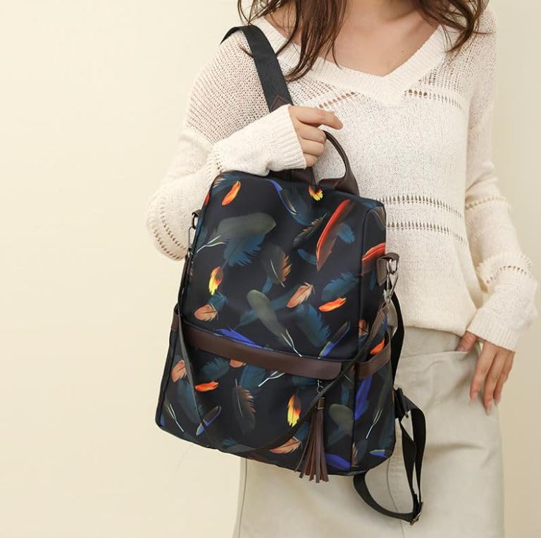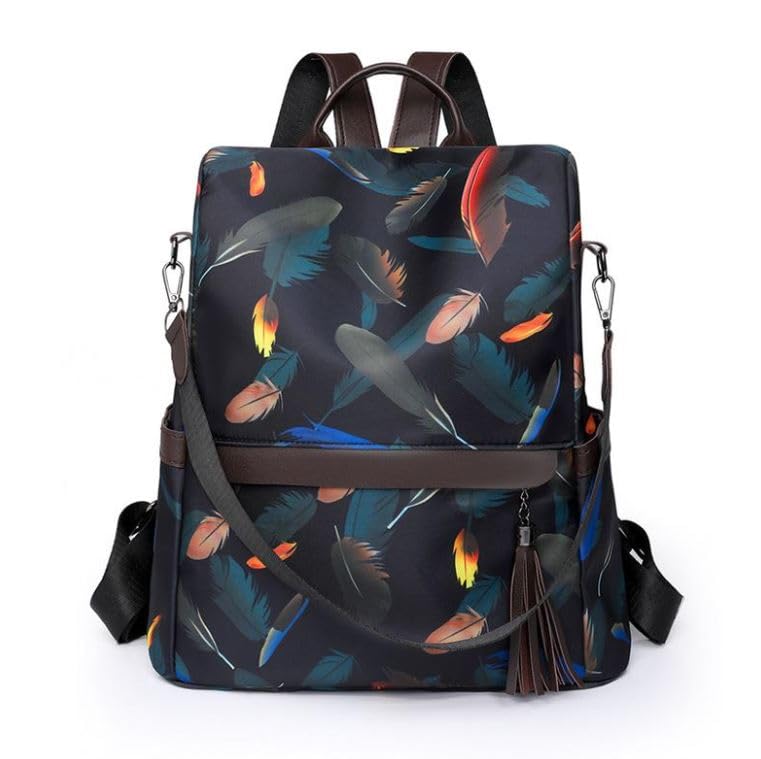 Generic - Fashion Feather Print Backpack, Anti-theft Design, Waterproof Oxford Fabric, Brown Leather Straps, Tassel Accent