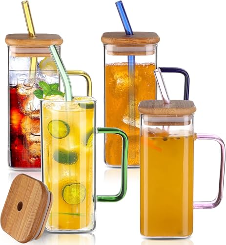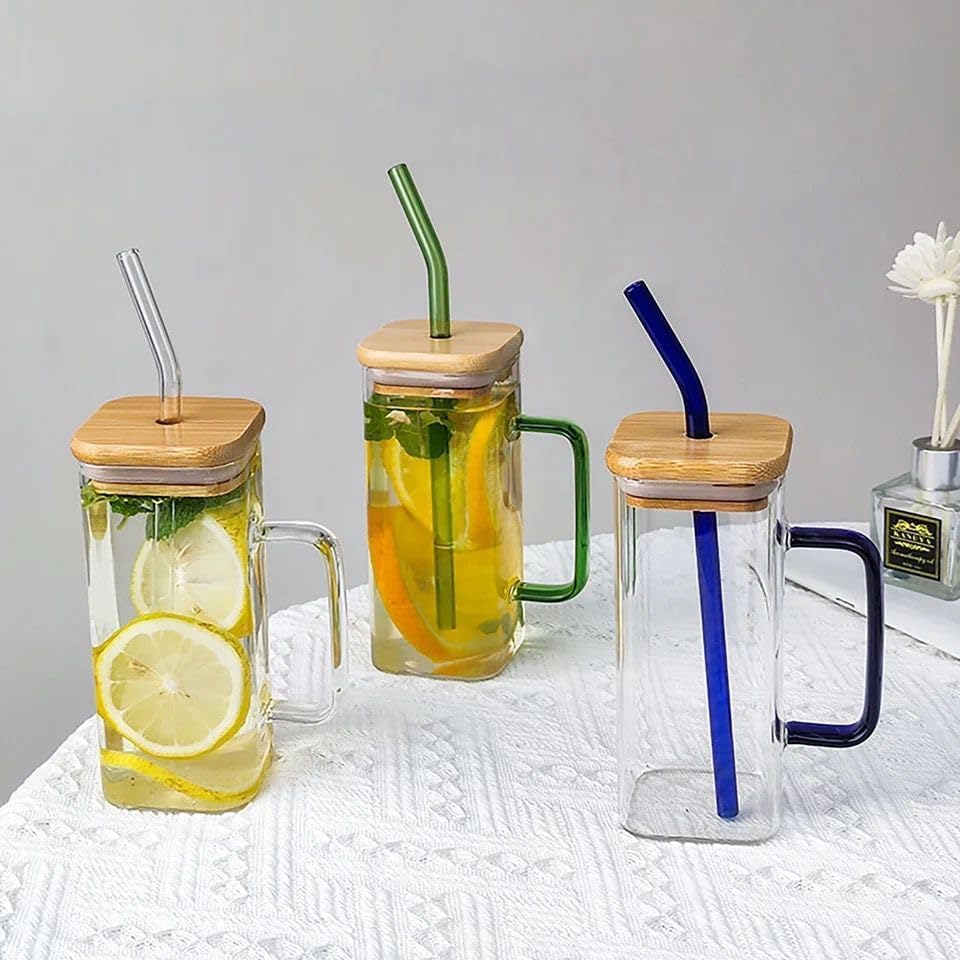 Generic - كوب زجاجي مربع بغطاء خشبي وشفاطة من فاشون هوم - سعة مثالية للمشروبات من فاشون هوم - زجاج بايركس مقاوم للحرارة - مع شفاطة وغطاء خشبي