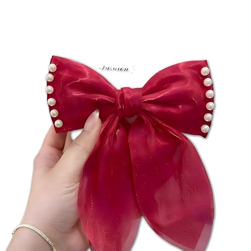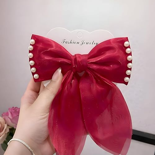 Generic - Fashion Jewelry Organza Bow Hair Clip - Elegant pearl embellished hair accessory with delicate ribbon streamers for daily wear and special occasions. (red)