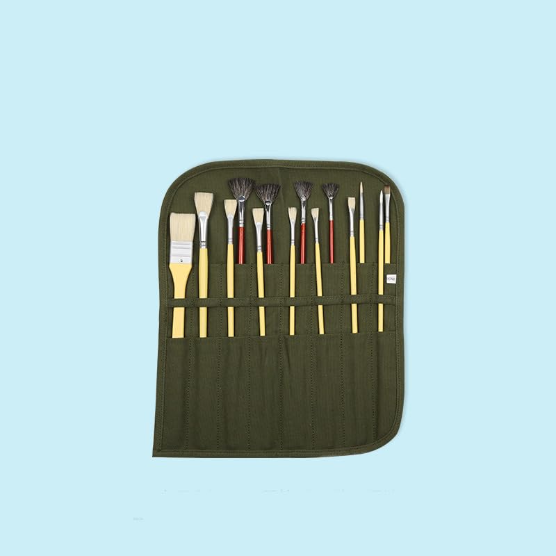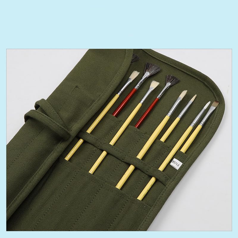 - مصنوع من مادة قماشية متينة بلون أخضر عسكري، يحتوي هذا الحامل الفاخر وصندوق التخزين على 24 فتحة جيب على صفين لتخزين الفرش وأقلام الرصاص. تحتوي الفتحة العريضة بمقاس حوالي 2.5 سم على مساحة كافية لتناسب فرشتين في فتحة واحدة.