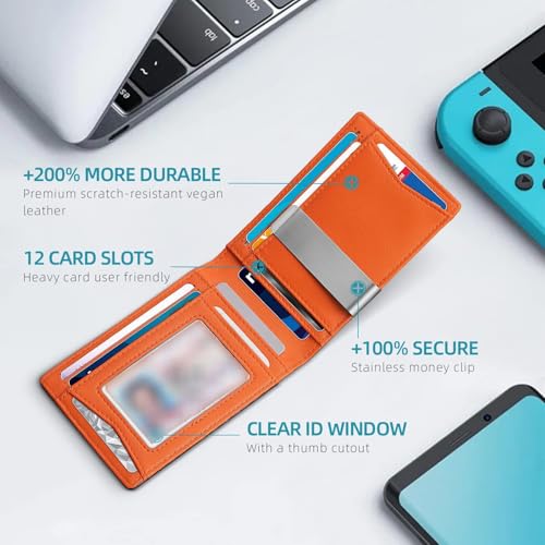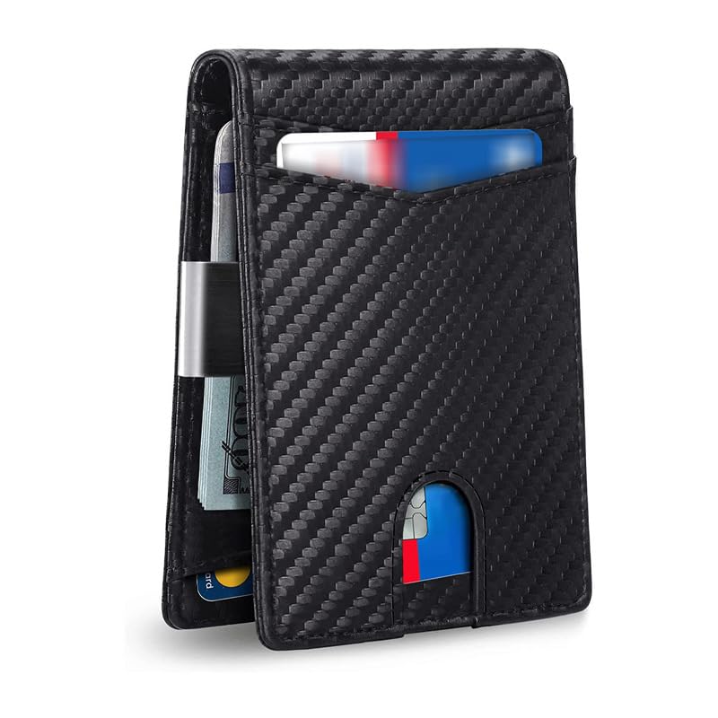 fashion mania - محافظ رجالية نحيفة من الجلد قابلة للطي بمشبك للنقود مزودة بتقنية حجب تحديد الهوية بموجات الراديو لحماية البطاقات، محفظة صغيرة وبسيطة التصميم بسعة 11 بطاقة، تأتي في علبة هدايا من فاشون مانيا (أسود)