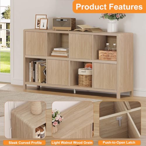 FATORRI - FATORRI 8 Cube Bookshelf with 4 Doors, Modern Mid Century Wood Book Shelf with Storage, Low Horizontal Cubby Bookcase for Home Office (Light Walnut)