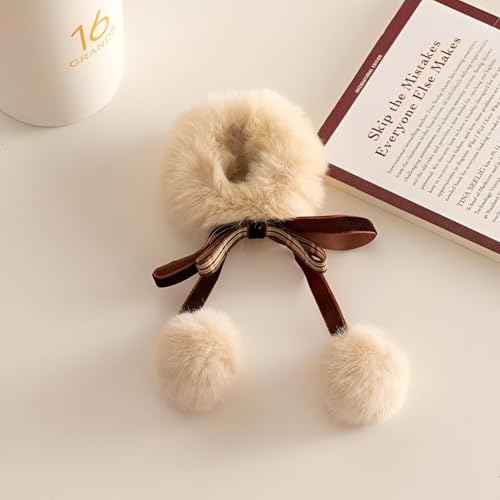 Generic - Faux Fur Hair Scrunchies - Plush Beige Elastic Hair Ties with Bow and Pom Pom for Winter, Cozy Hair Accessories in Random Colors