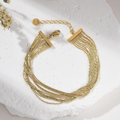FAYROZ JEWELLERY - سوار سلسلة متعدد الخيوط من الستانلس ستيل عالي الجودة مطلي بالذهب بتصميم عصري متعدد الطبقات قابل للتعديل، يمنح إطلالة أنيقة وفاخرة مع تفاصيل متداخلة تضيف مظهرًا جذابًا .من فيروز جوليري.