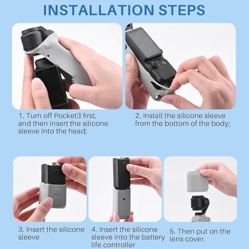 - 【SILICONE COVER EASY TO INSTALL】Turn off Pocket 3 first and insert camera lens into to the silicone cover. Then install the silicone case of the body. Tie the anti loss rope onto the silicone cover and screen protector on the body. Finally, insert the silicone case into the 1/4 thread handle and battery handle.