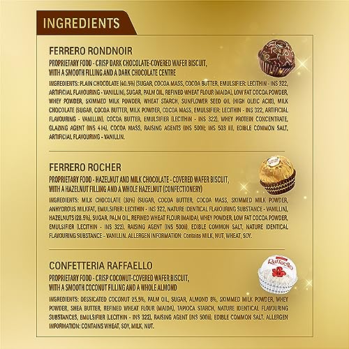 - شوكولاتة فاخرة مستوردة- تقدم فيريرو مزيجًا لا يقاوم من فيريرو روشار ورافايلو وروندنوير، وهي مثالية للاستمتاع والإهداء.