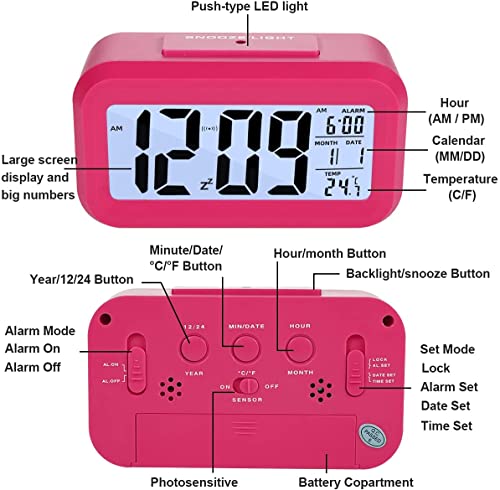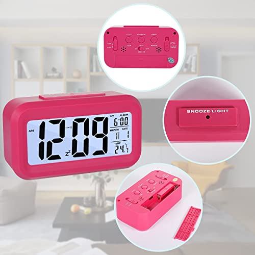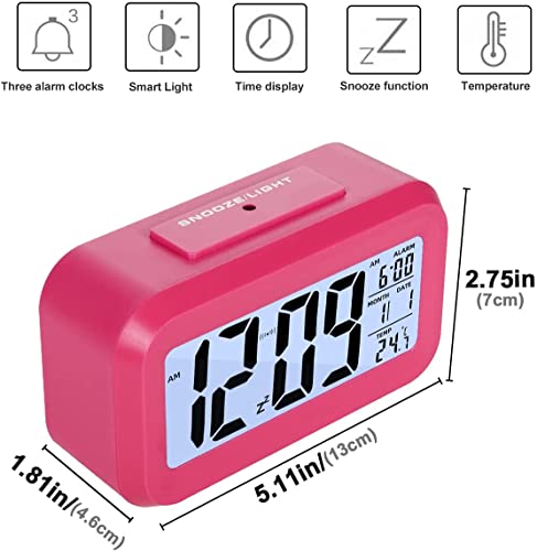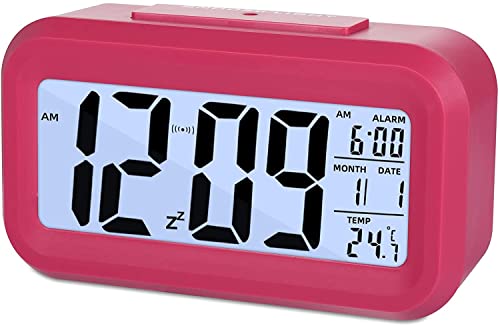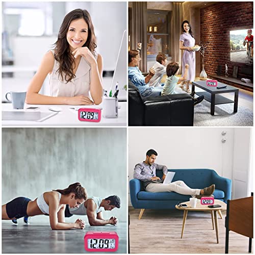 FGen - FGen Digital Alarm Clock, LED Alarm Clock, Digital Alarm Clock with Large LED Temperature Display, Digital Battery Alarm Clock, Temperature, Smart Sensor Light (Pink)