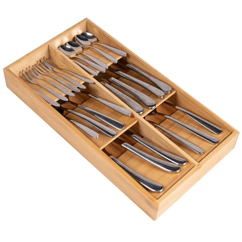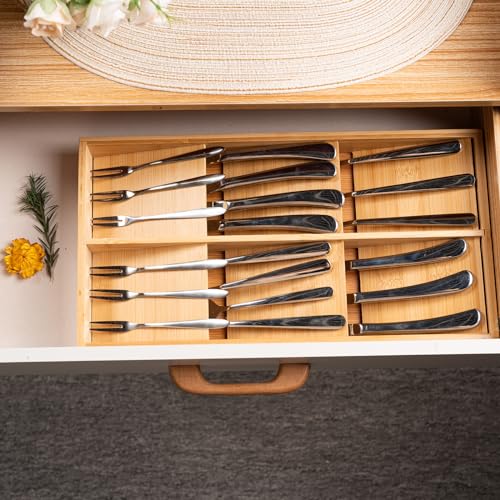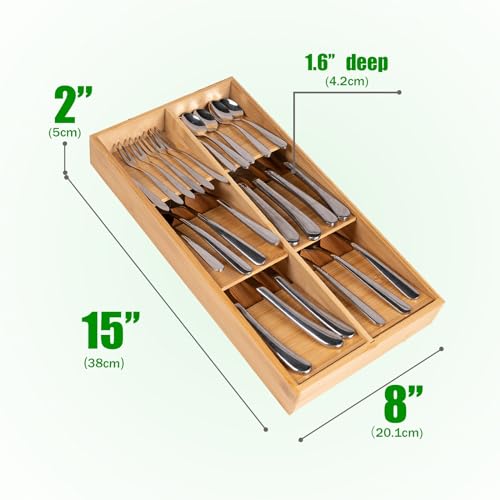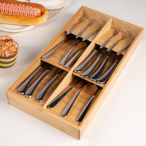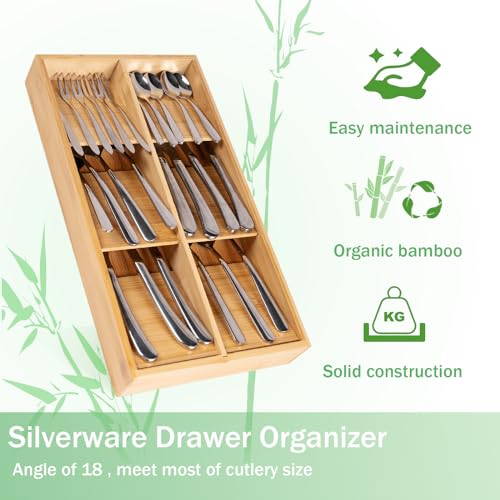 - 【 أساسيات المطبخ】 منظم الأدراج الفضي هذا مصنوع من الخيزران، وهو مناسب جدًا لتخزين أدوات المائدة الخاصة بك. يمكن أن تساعدك على فصل السكاكين والشوك والملاعق وأدوات المائدة الأخرى. إنه مريح وسريع عند الاستخدام، وهو مساعد عملي في المطبخ!.
