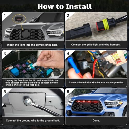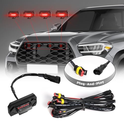 - Package Includes: There are Toyota Tacoma 2020-2023 TRD Off Road & Sport Front Grille Lights x 4, Harness x 1, Fuse x 1 in package. The Toyota Tacoma LED front grille lights kit help you with easy installation.