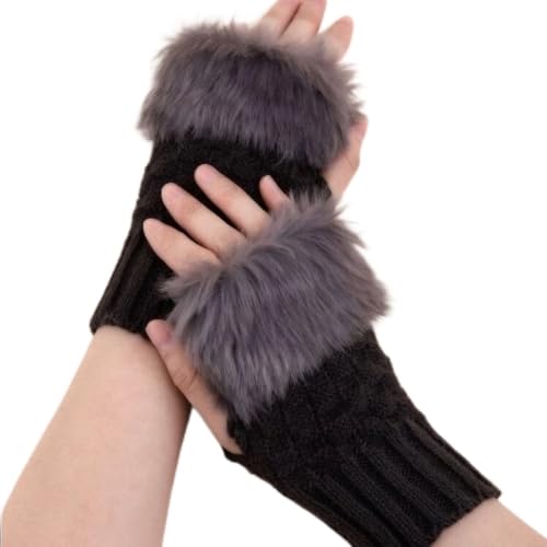 Generic - Fingerless Gloves with Faux Fur Trim, Black, Knitted Winter Arm Warmers
