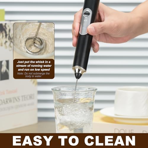 - ☕【Easy to Clean】To clean the milk frother, simply put the whisk in hot/warm water or running water, briefly turn it on, then it is clean immediately. To avoid spilling your drink and making a mess, please turn on the frother after putting it deeply into your drink, and always turn off it before removing from your mug.