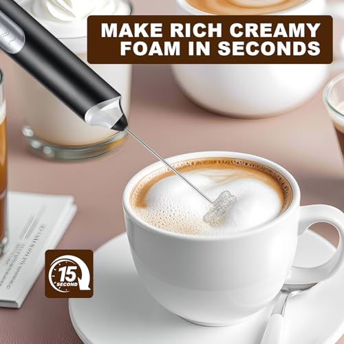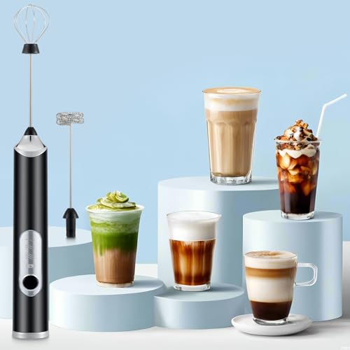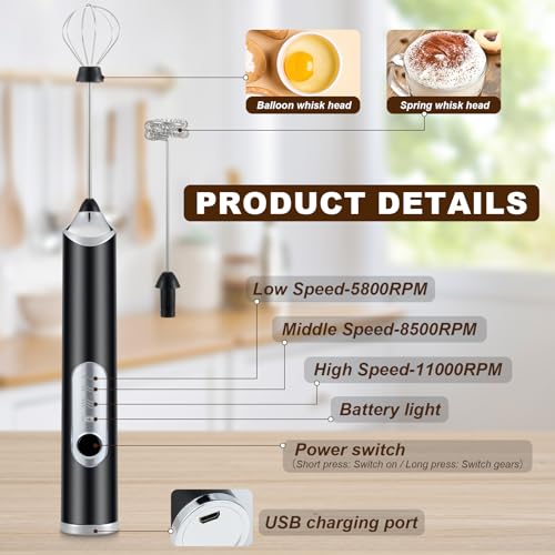 FIOUSY - Handheld Electric Milk Frother with 2 Heads, Coffee Whisk Foam Mixer with USB Rechargeable 3 Speeds, Foam Maker Blender for Latte, Cappuccino, Hot Chocolate, Egg (Black)