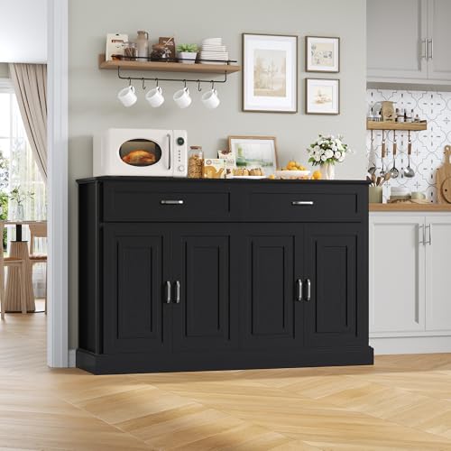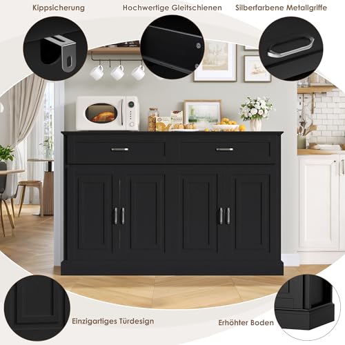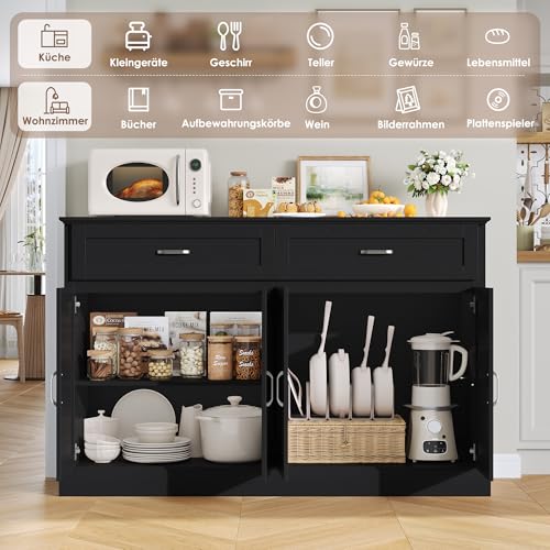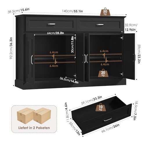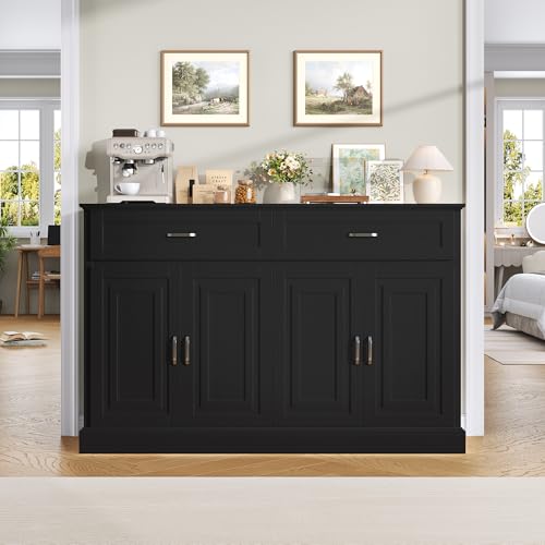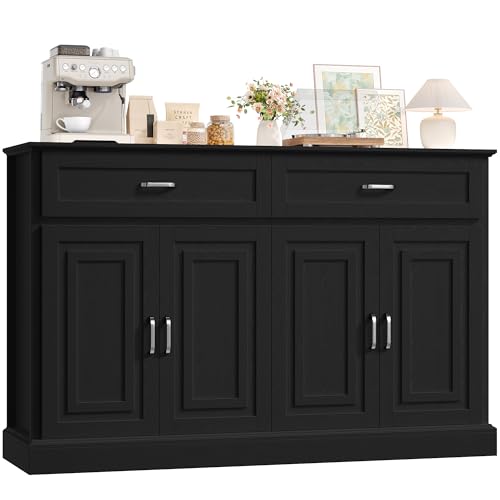 - Ample Storage Space - Featuring 2 large smooth-gliding drawers and 4 cabinets with doors, this black sideboard allows you to organise your belongings neatly and keep your space clutter-free. Additionally, the spacious countertop provides ample room for appliances such as coffee machines and microwaves, or even serves as a practical workspace for meal preparation