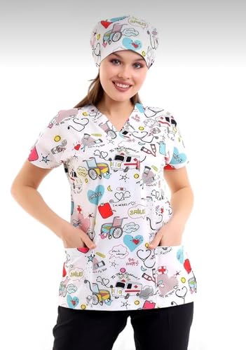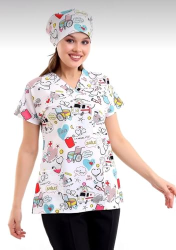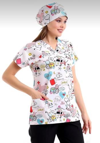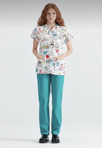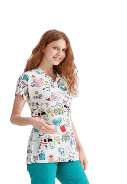 Resan Medical wear - مقشر طبي مطبوع لمستشفى الاسعافات الاولية للجنسين - قميص طبي جراحي فقط - اكمام قصيرة - زي طبي (ازرق ، مقاس XS)