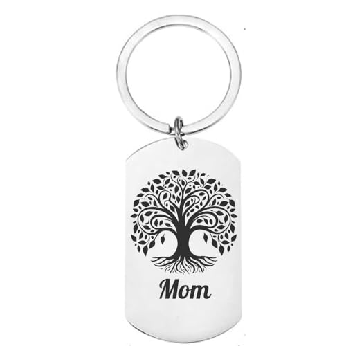First Glass Designs - Personalised Tree of Life Keyring for Mom, Stainless Steel Dog Tag, Laser Engraved Message, Silver