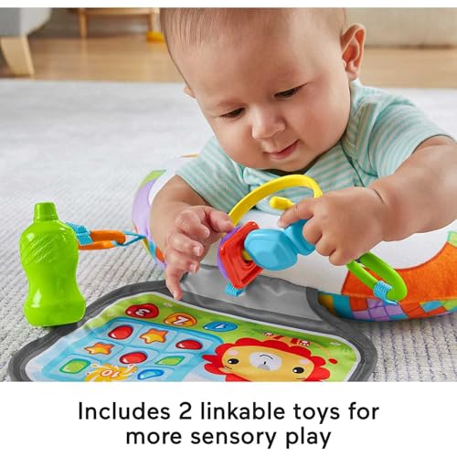 - Supportive and fun gamer-themed tummy time wedge with two linkable toys