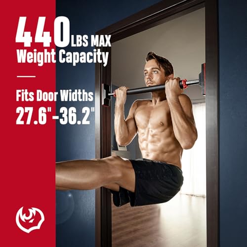 - 𝗛𝗜𝗚𝗛 𝗟𝗢𝗔𝗗 𝗕𝗘𝗔𝗥𝗜𝗡𝗚 𝗖𝗔𝗣𝗔𝗖𝗜𝗧𝗬 — Constructed with high-quality steel tube, the core of the bar is 1.5mm in thickness which allows it to bear a weight capacity of 600lbs. The supporting feet's bow-shaped form enables them to sustain higher weight with greater friction. A PVC cushion with a thickness of 1300mm has been added to the support surface to boost stability and increase resistance, preventing the pullup bar from coming off during training and protecting the door frame.