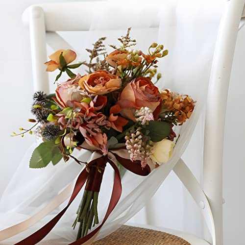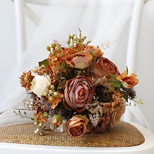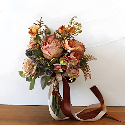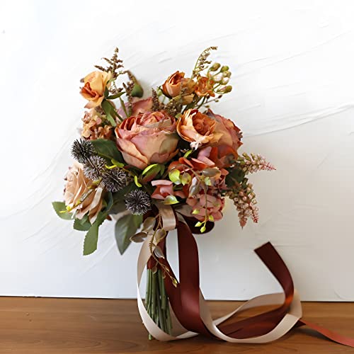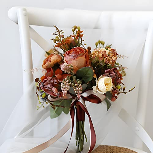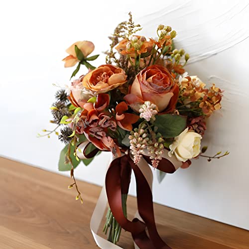 Fiwisora - Artificial Wedding Bouquet for Brides Bridesmaid Holding Flower with Greenery Artificial Fabric Rose Wedding Flower Bridal Toss (Vintage Orange)