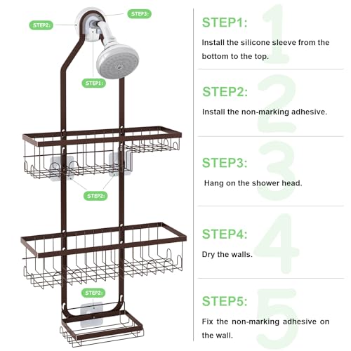 - 【تركيب مضاد للتأرجح】 يأتي رف منظم التخزين المعلق للحمام هذا مع مطاط غير قابل للانزلاق وأربعة مواد لاصقة فائقة الالتصاق تربطه بإحكام برأس الدش والجدار، مما يمنع التأرجح ويضمن الثبات. يمكن لمنظم الدش الخاص بنا تلبية احتياجات التخزين لمستلزمات الاستحمام بالكامل دون القلق بشأن تحمل الوزن.