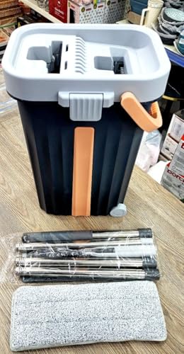 Generic - مجموعة جردل وممسحة مسطحة مع عجلات و2 وسادة لإعادة التعبئة، بتصميم قفل مشبك، أسود ورمادي