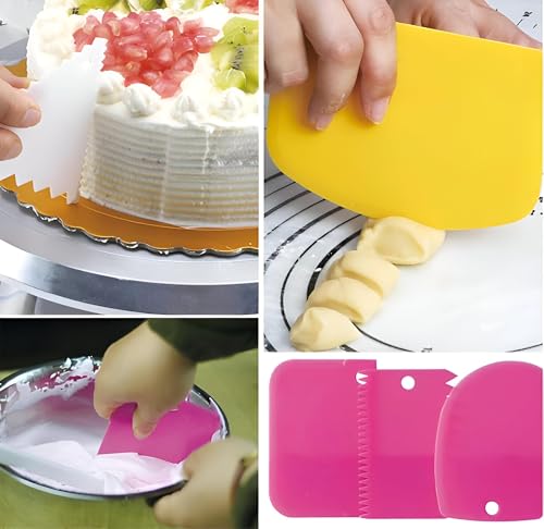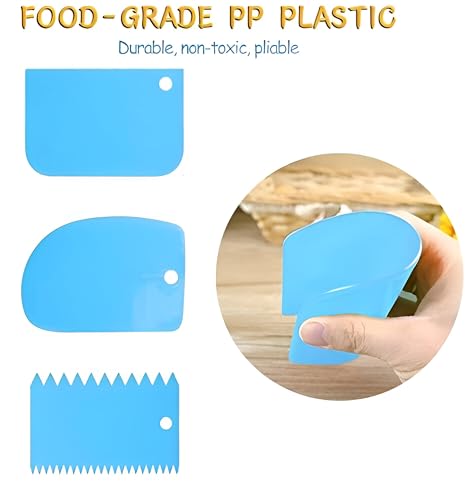 - This set includes three versatile plastic dough scrapers, each designed with unique edge styles—rough, curved, and flat—allowing for precise cake decorating, dough handling, and food scraping in various kitchen tasks, all made from food-grade polypropylene for safety and durability.
