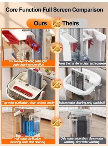 - تصميم عملي: دلو تنظيف بنظام عصر ذاتي مع لوحة عائمة مزدوجة الطبقة تسهل عملية التنظيف والعصر بضغطة خفيفة، مع نظام تنقية المياه العلوي للحفاظ على نظافة القماش